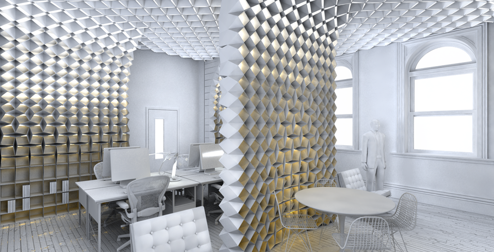 The membrane functioned as storage/ pinup space while also acting as medium for a LED bay lighting system. This bayed approach allowed for the programming of the direction intensity and color of the lights to meet the differentiated needs of the rooms multiple functions. During a typical work day the consistently distributed lights on the ceiling plane could be set to locally light over work spaces only where needed, or create a homogenous white light for publication review. When exhibitions were developed the vertical lights could be brightened and the ceiling lights dimmed to reflect the gallery lighting conditions. During evenings when working on monitors and laptops, the wall lights would subtly glow lowering the contrast between screen and room reducing strain on the eyes. Or they could be lowered to simply floor lighting for a quick nap. When unoccupied the lights would gradate to Pratt’s school colors branding the relationship between the pedagogy and practice of the school.