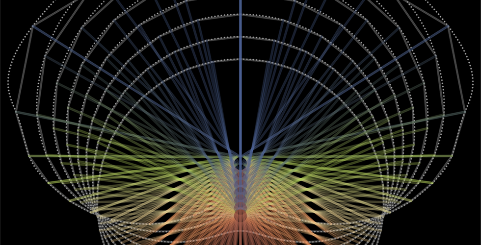 The inspiration for beginning these experiments comes from recent work in developing setout points for architecture projects which require rules for the placement and distribution of conceptual shapes in the real world without the aid of GPS technology or CNC production, but instead, basic geometry which can be measured, subdivided and marked in physical space. The simple idea these experiments look to explore is taking two shapes, breaking them into faceted sections and exploring the relative positions of the facet nodes by drawing lines with computationally derived lengths. The first set of trials in the relative^n series focuses on the study of two-dimensional shapes derived from the relationships between different primary curves, polygons, and Euclidean primitives. The new shape profiles are derived by simply placing one curve inside the other, then dividing the curves into equally and an equal number of points. A vector is then created between each point on the inner and outer curve with the same index numbers. These vectors relative amplitudes are then inverted, the smallest becomes the largest and largest the smallest and the positions are moved from an origin on the inner curve to the outer curve producing a derivative curve that in most cases encompasses the two generative base curves.